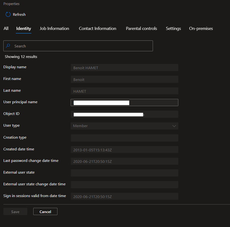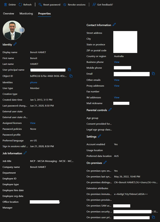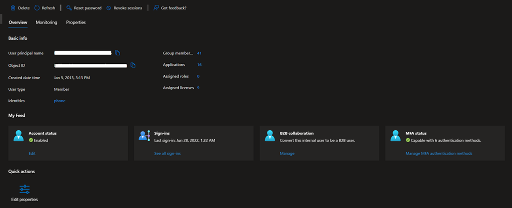 - The properties tab gives you access to the user properties with option to edit them; the updated properties tab is now showing information about on-premises attributes which is quite useful when troubleshooting.