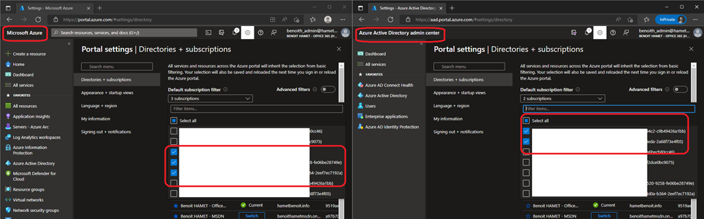 On the right side you have my Azure Subscriptions filter and on the left side the Azure AD Subscriptions filter; as you can see (even if I have hidden the subscription name) they are not in sync