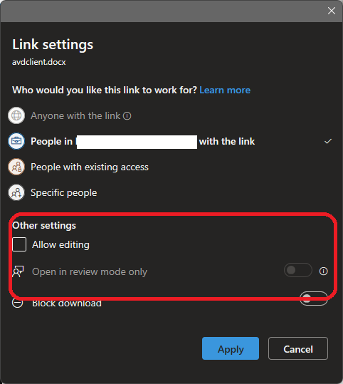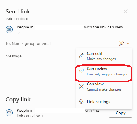 To use the review sharing mode, depending of your default sharing link options and client used, you may have to change the sharing permission to select Allow editing and then select Open in review mode