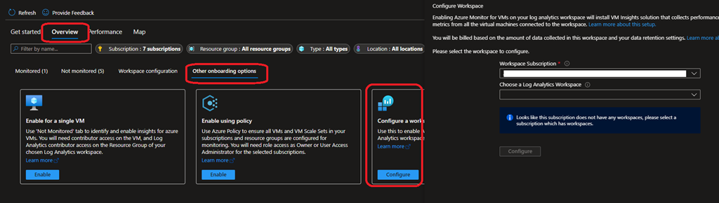 Because VM Insights uses a Log Analytics workspace (if none is existing a default one will be created), you need to configure the Log Analytics workspace to use for VM Insights by accessing the Overview\Other onboarding options tab to then configure the Log Analytics workspace