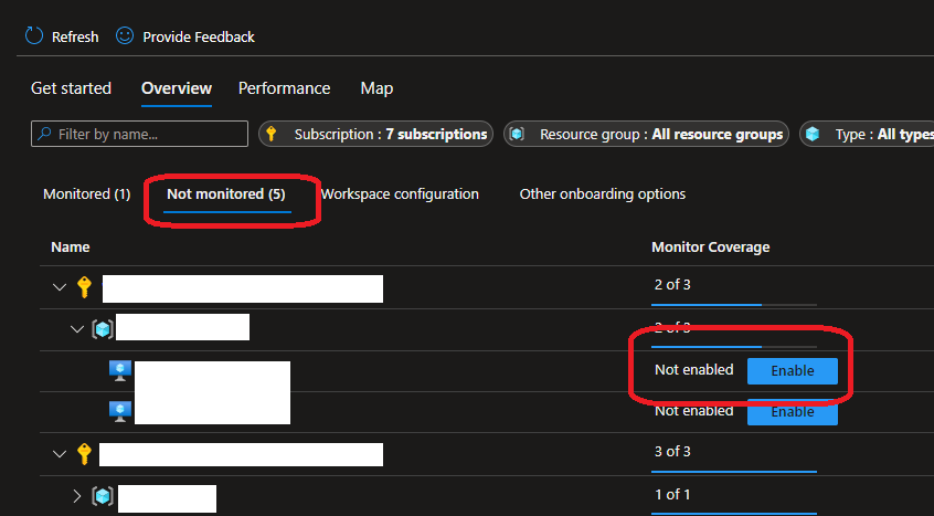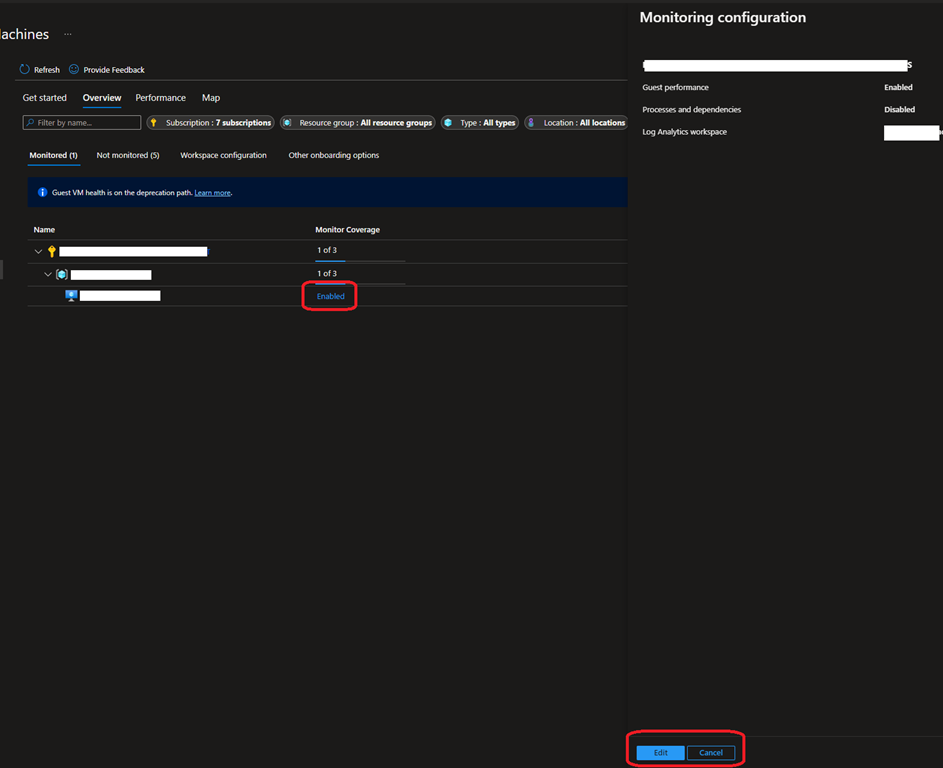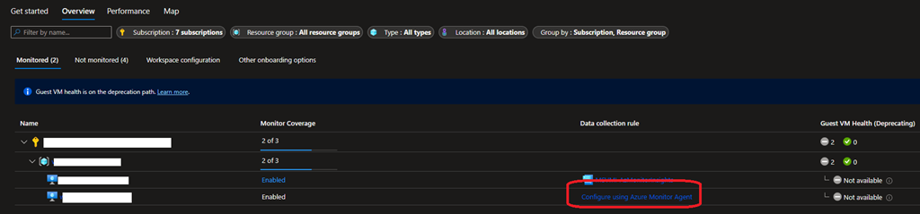 From there you will be able to identify which virtual machines are enabled or not for monitoring and Insights and then manage the configuration of the Insights configuration