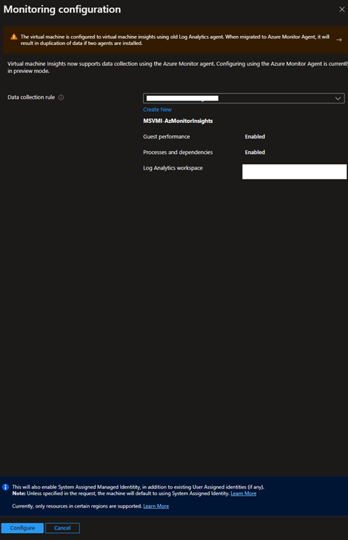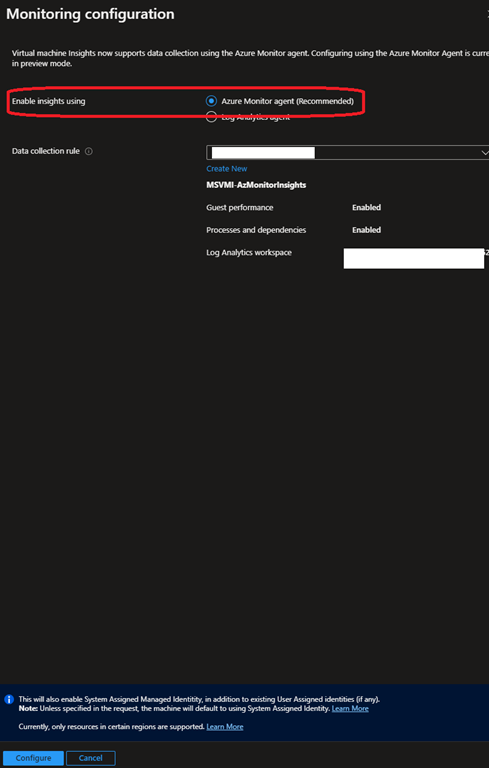 You can then edit existing onboarded virtual machines to use a specific Log Analytics workspace and/or enable the Dependencies agent by clicking on the Enabled link (keep in mind the supportability matrix for Dependencies (see https://docs.microsoft.com/en-us/azure/azure-monitor/agents/agents-overview?tabs=PowerShellWindows#supported-operating-systems), as well as the Data Collection Rule (DCR) – you can create a new one from there too (MSVMI will be appended to the rule name you create).