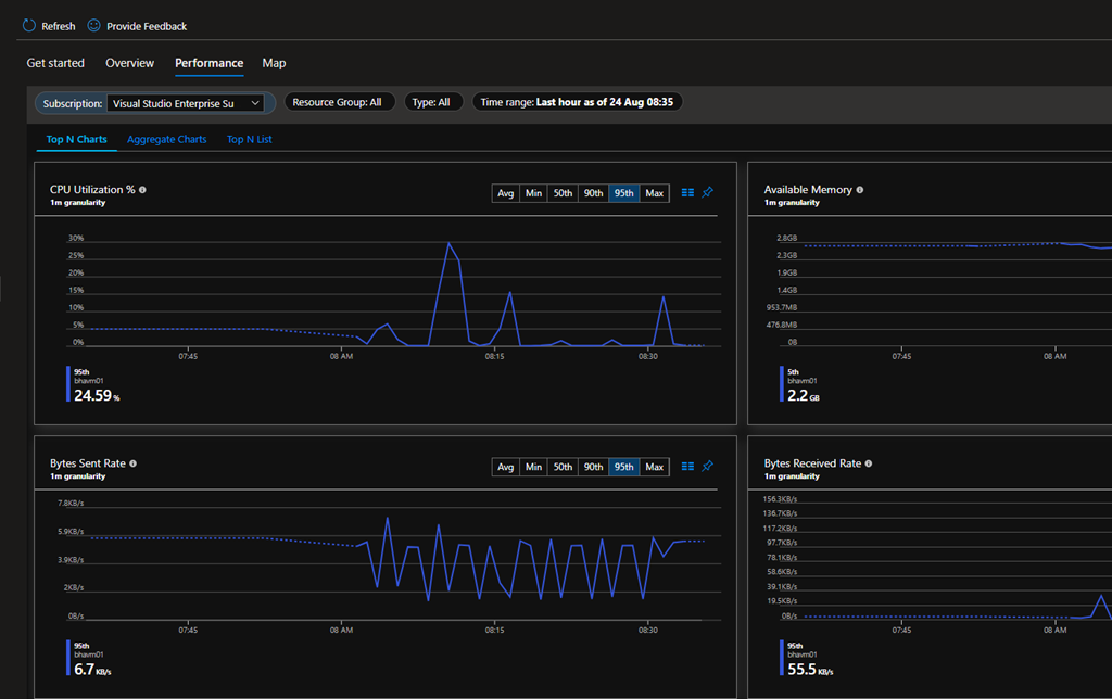 Once your virtual machines are onboarded, you can now view their performance and dependencies mapping using the Performance or Map tabs