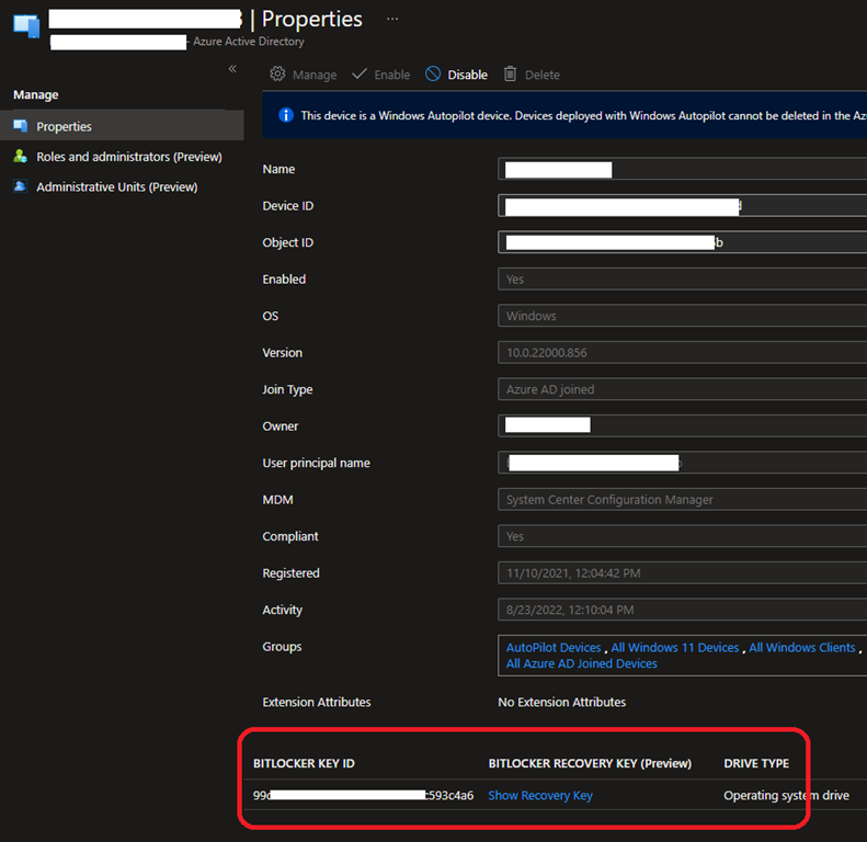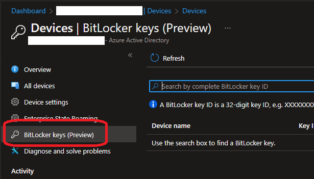 By default, end-users can access the BitLocker recovery key for the device they own by accessing the BitLocker keys blade in Azure AD (also called self-service BitLocker key access) or by accessing the device they own properties