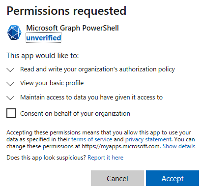 When connecting to Microsoft Graph, you may be requested to grant permissions – I would recommend to enable the Consent on behalf of your organization