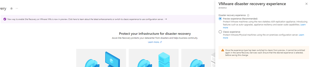 If you have to create a new Site Recovery for use with Azure Site Recovery for VMWare, be aware that the preview experience is set as the default experience.