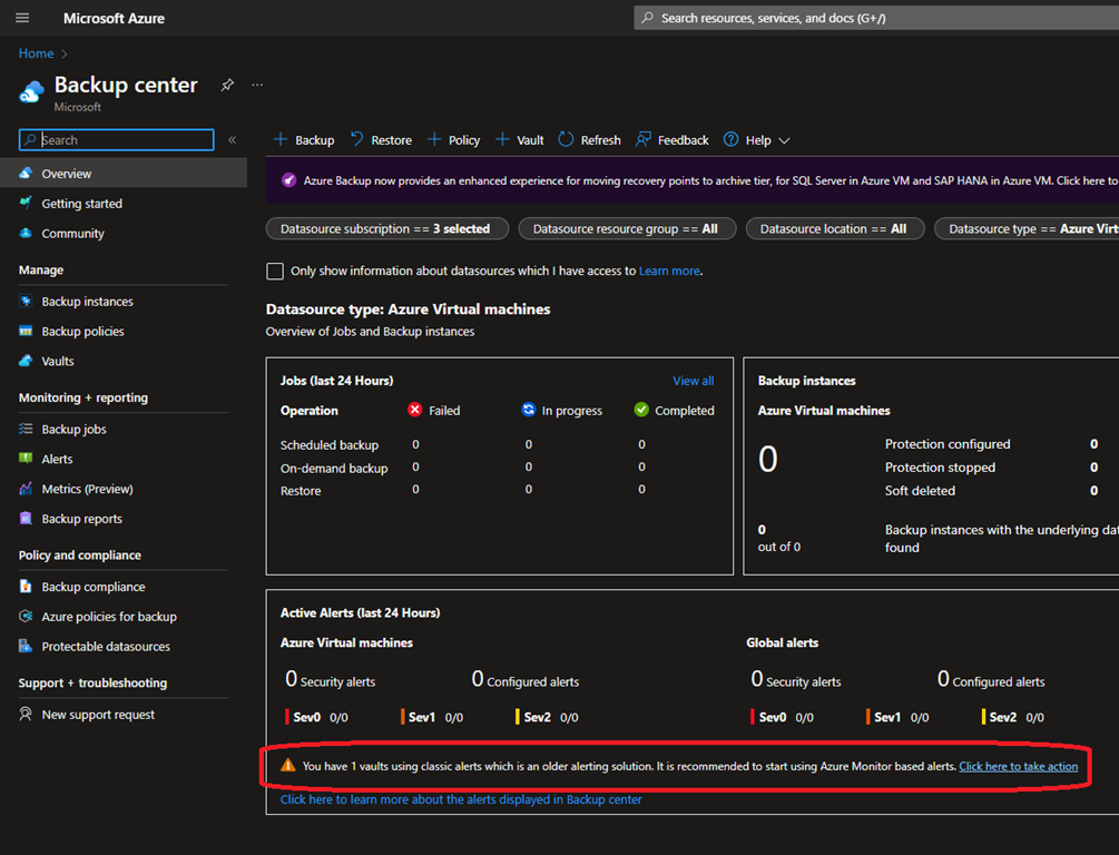 To migrate to Azure Monitor alerting, connect to your Azure portal (https://portal.azure.com/) and access the Backup Center (the new central location to manage Recovery Vaults)