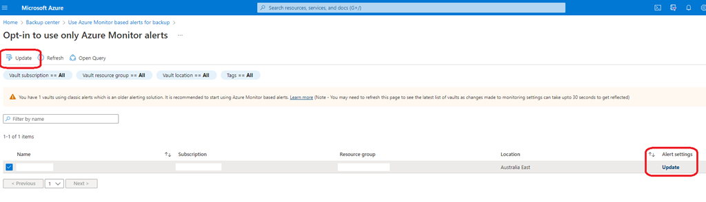 Once done you will need to go back to the “Click here to take action” blade to opt-out of the classic alerts for Azure Backup by using the Manage alerts button to select the recovery vault(s) you want to opt-out for classic alert and choose Update (I had to switch back to Azure theme as the text in Dark mode is not visible)