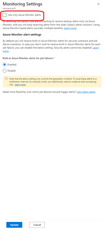 When hitting the update button an additional blade will be shown to let you enable to use only Azure Monitor alerts