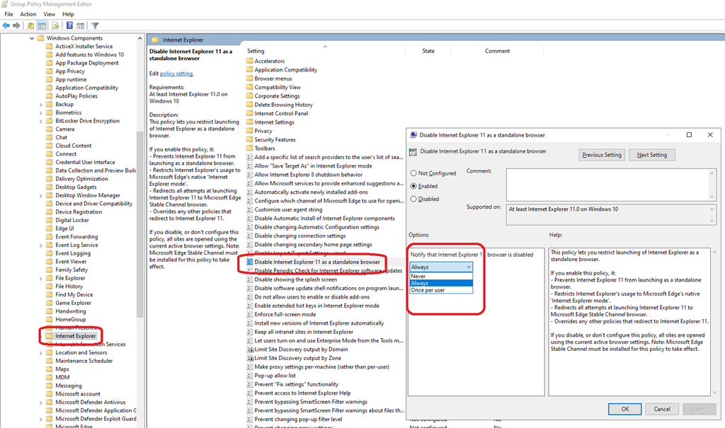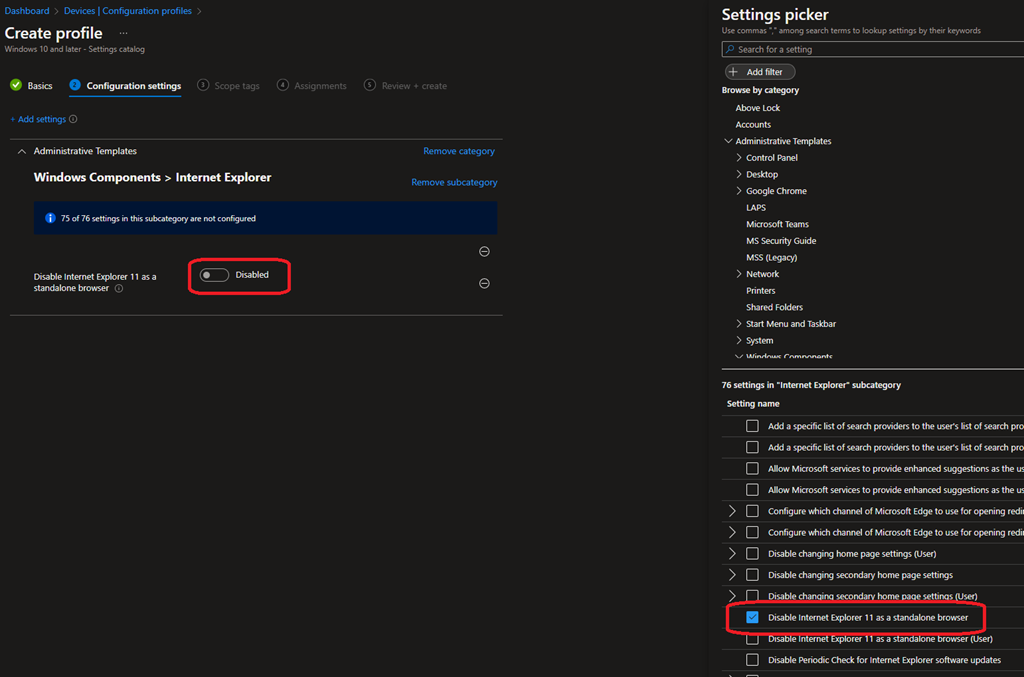 Well, if you don’t want to wait for the policy phase you can use either group policy or Intune Device Configuration profile (Settings Catalog) to configure the Disable Internet Explorer 11 as standalone browser available under the Computer Configuration\Administrative Templates\Windows Components\Internet Explorer