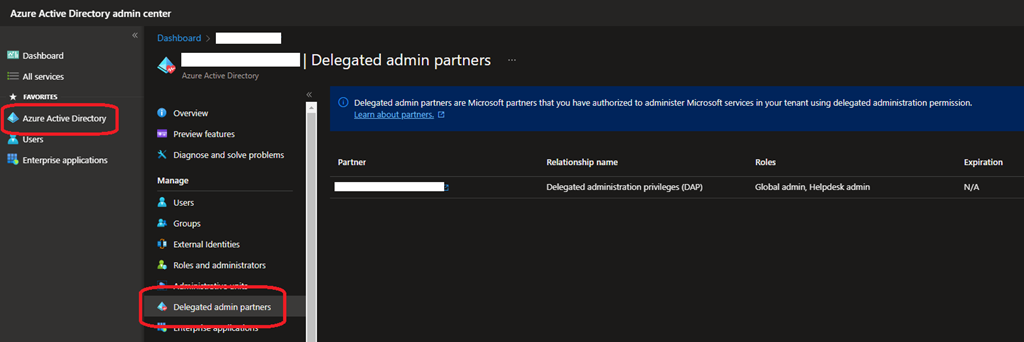 Until now, the only place to see the delegated admin partners was from the Office 365 administration portal (https://admin.microsoft.com/) under the Settings\Partner Relationships blade.