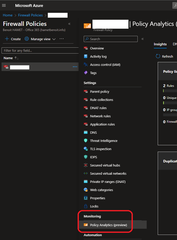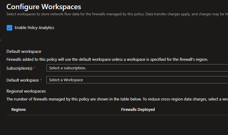 Pricing: while in preview, the Policy Analytics is provided at no additional cost if the Firewall Policy is associated to more than 1firewall; if associated to only 1 firewall, it will be billed per policy (https://azure.microsoft.com/en-us/pricing/details/firewall-manager/)