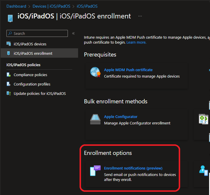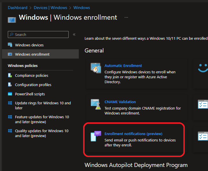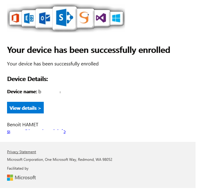 Intune/Endpoint Configuration Manager can now enable notification – either by email or push notification – to notify end-user when a device has been enrolled by them.
