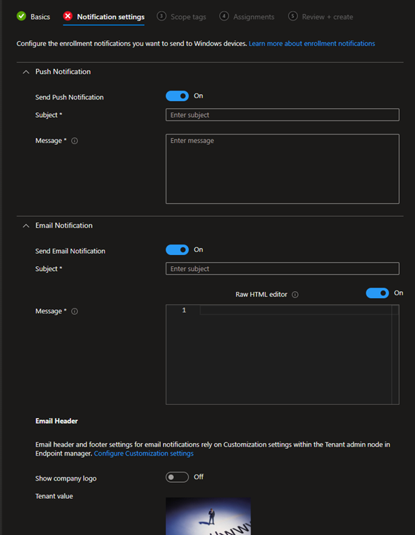 The configuration process is the same for all platforms: name the enrollment notification profile, define the notification settings (push/email), scope tags and assignments