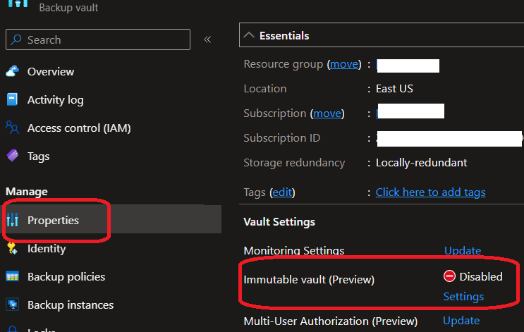 Then access the Properties tab to turn on immutable vault