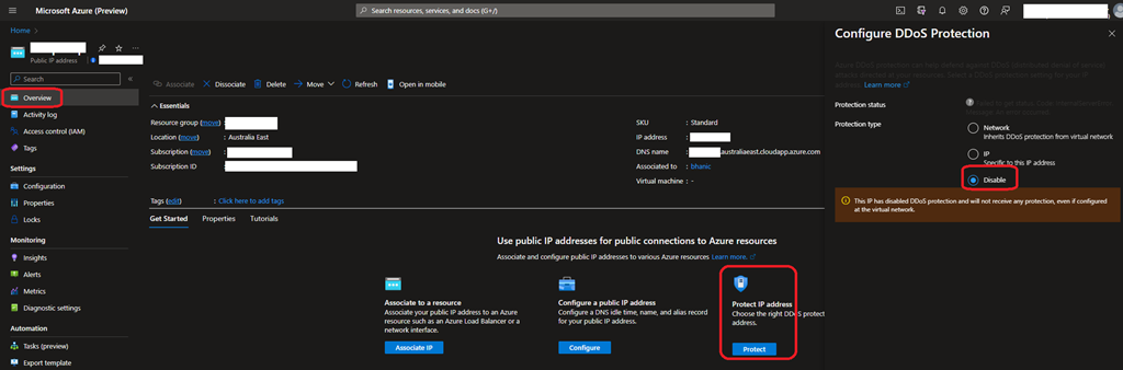 From the Overview blade, click on the Protect button available under the Protect IP address section to then select the Disable option