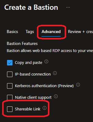When creating a new Bastion the option to use shareable link is available at the Advanced step