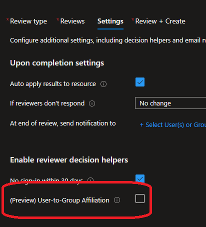 Then create or edit an access review, the option to enable (off by default) User-to-Group Affiliation is available at the Settings step