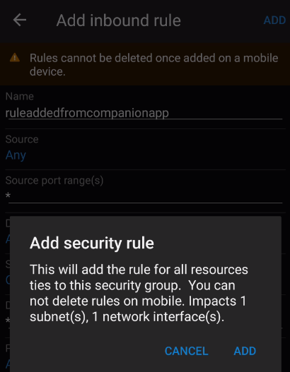 IMPORTANT a rule added from the Azure Companion application can not be deleted from the Azure Companion application