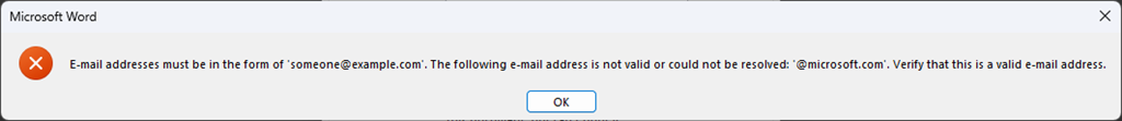 Include the domain name between quote – like ‘@mydomain.com’ – or you will get an error message saying the email address can not be validated