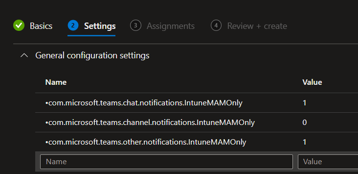 Then you need to create an Application Configuration policy for Teams (same as for the protection policy you need to ensure Microsoft Teams is included in the application scope) and implement the following settings – the value 1 means notification is enabled/authorized, while the value 0 means notification is not enabled/authorized