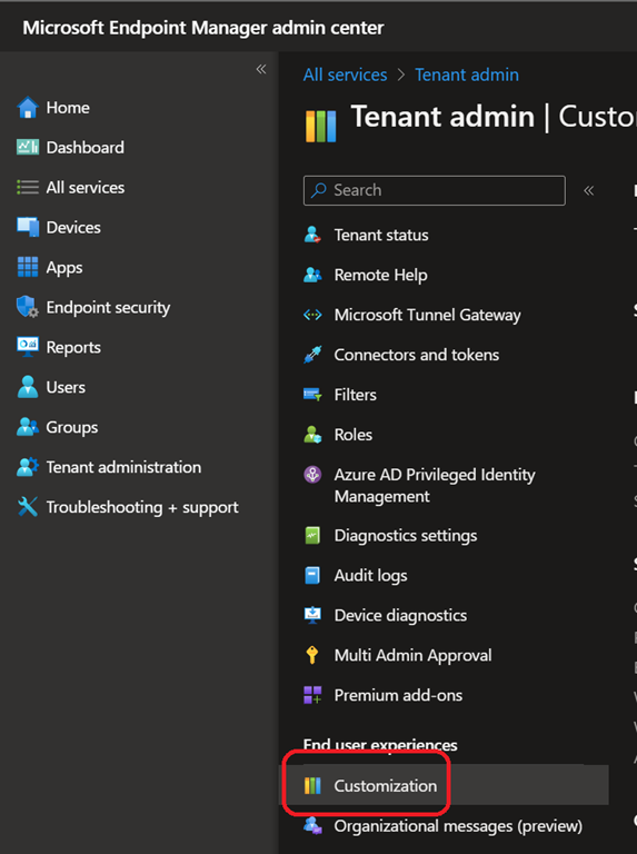 To manage this capability, connect to your Intune portal (https://endpoint.microsoft.com/) to access the Tenant administration\Customization blade