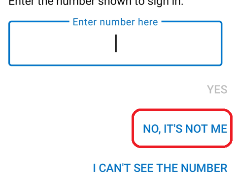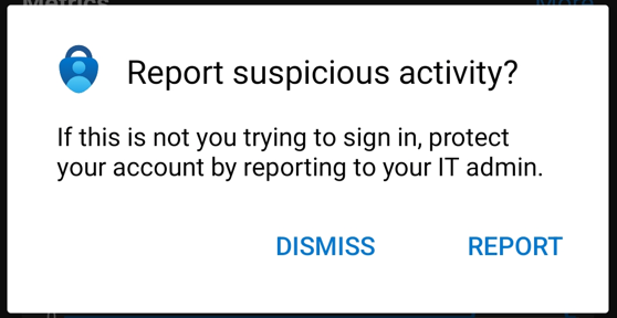 To report the suspicious activity the user has to use the No, it’s not me button on the Authenticator request