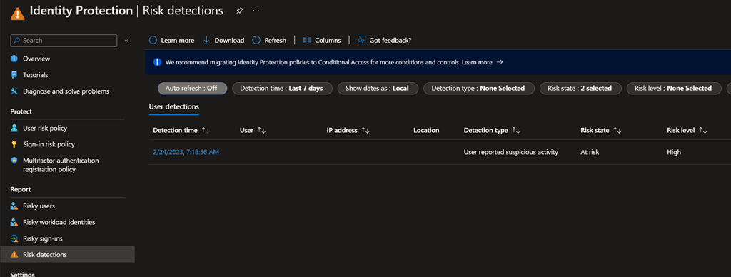 - either the Identity Protection\Risk detections blade; it will appear as User Reported Suspicious Activity for the detection type, with risk level High and source End user reported