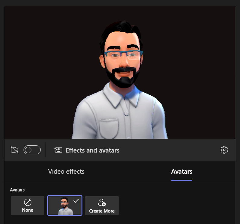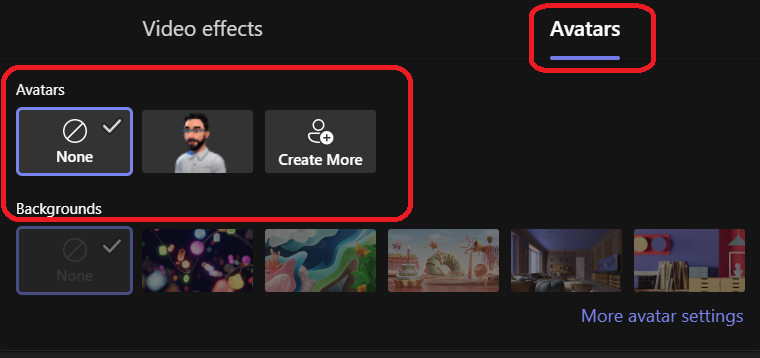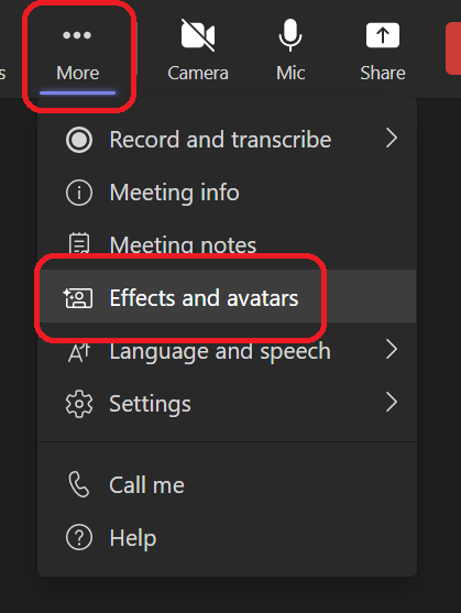 If you want to turn on your avatar during the meeting, just open the more menu to select Effects and avatar
