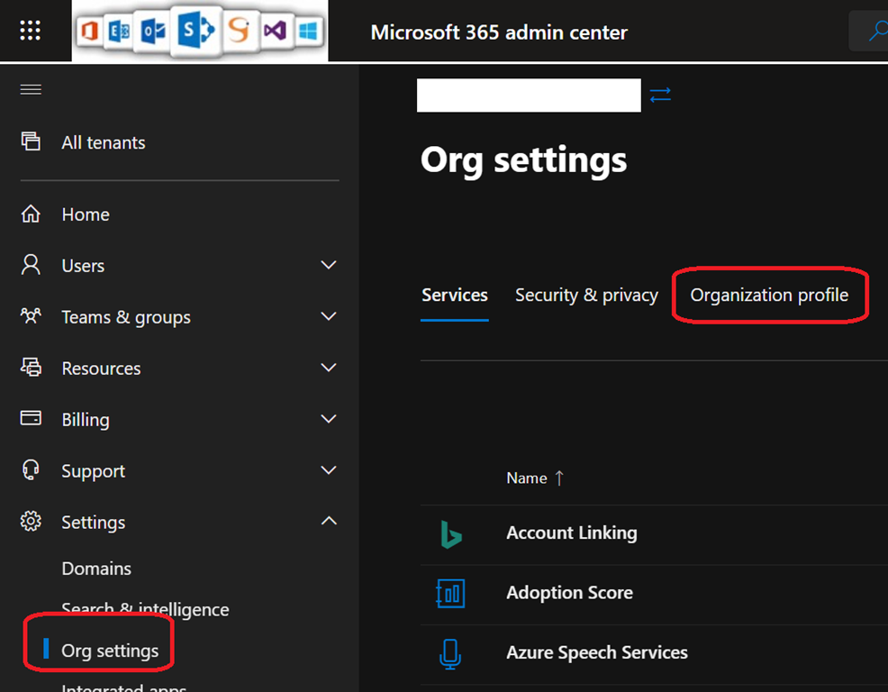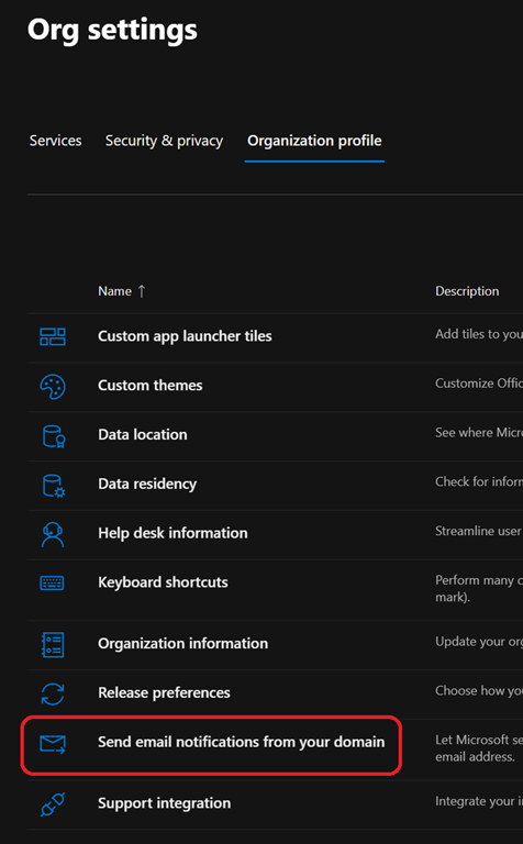 To enable the use of your custom domains for notification emails, connect to your Office 365 administration portal (https://admin.microsoft.com/) and access the Settings\Org settings blade to access the Organization profile tab