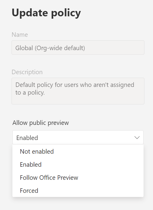 Well, good news as now you enforce the use of the public preview ring by selecting the new 4th option: Forced