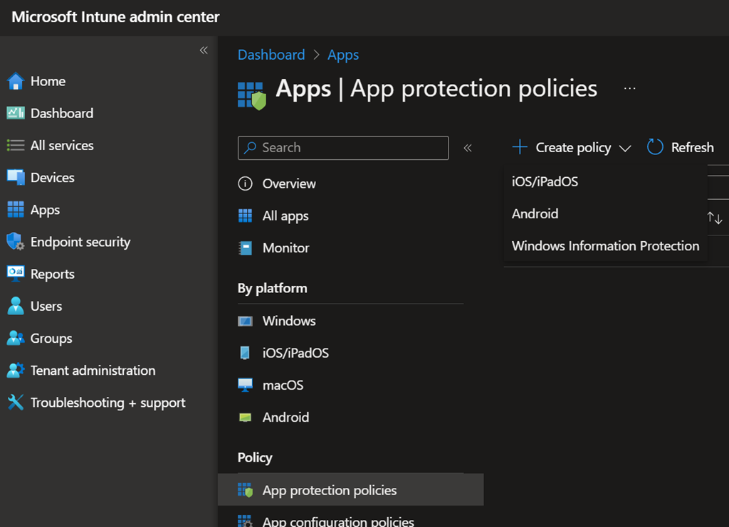 Before switching to the ‘Require application protection policy’ control, you will have to implement an Intune application protection policy for each operating system you want to support (iOS/iPadOS, Android or Windows [Windows Information Protection]).