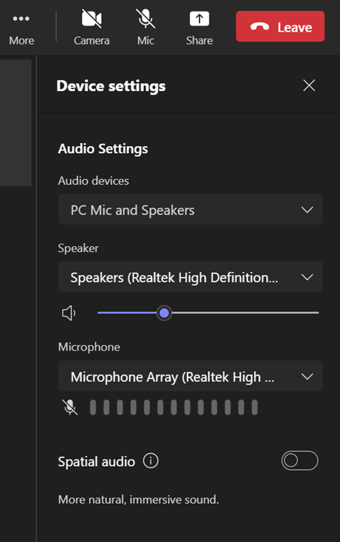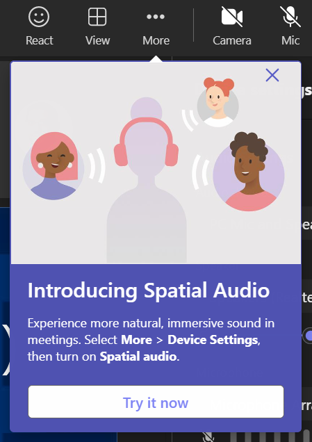 When joining a Teams meeting you now can enable spatial audio to allow a more immersive experience; especially when you are using device supporting spatial audio, like in a meeting room.