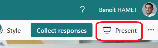 To use this new Present option, access to the Forms you want to present (https://forms.office.com/) and use the Present button available top right