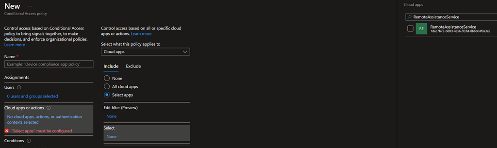 Then you can create and configure your conditional access for Remote Help by selecting the application RemoteAssistanceService