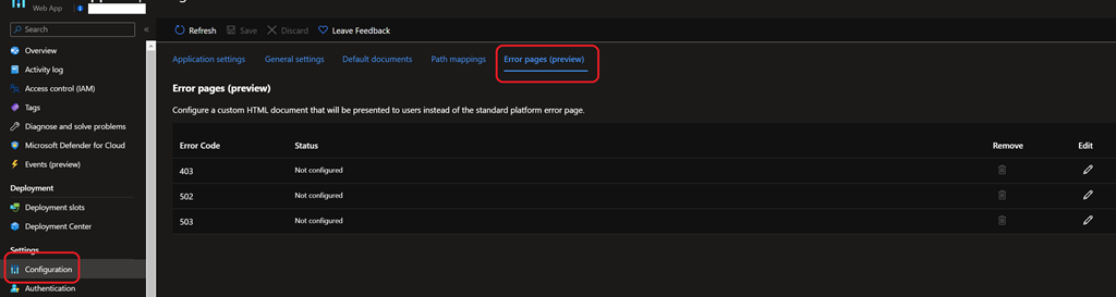 Access the Configuration blade to go to the Error pages section to edit the error codes