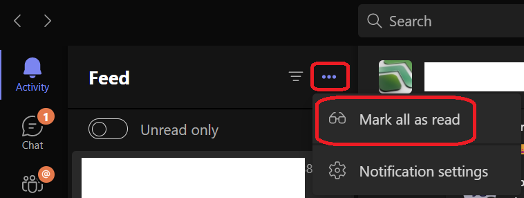 To mark all as read Activity Feed, access the Activity using your Windows Teams client and open the ellipsis (…) to Mark all as read