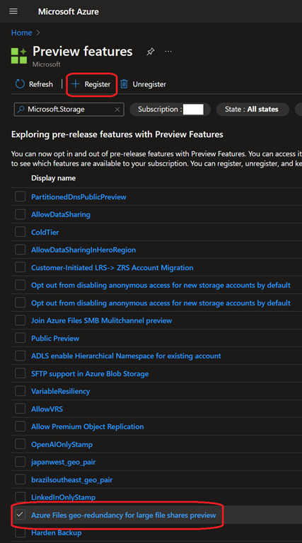 - Then search for Microsoft.Storage and locate Azure Files geo-redundancy for large file shares preview to register