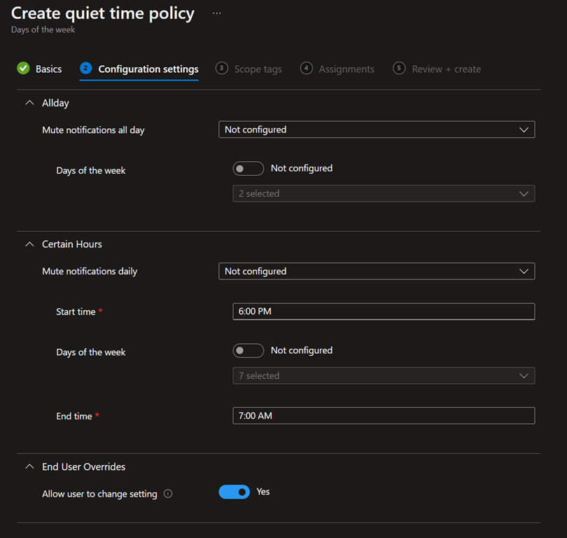 - Days of the week: automatically mute Microsoft Outlook email and Teams notifications on iOS/iPadOS and Android platforms during certain hours or all day on selected days of the week. For this type, administrators have the option to let end-users to override