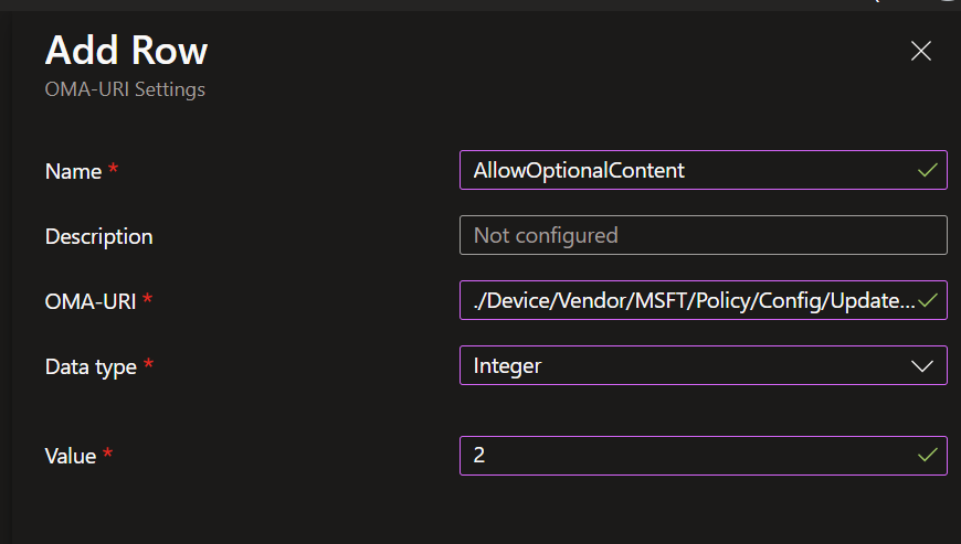 - OMA-URI: ./Device/Vendor/MSFT/Policy/Config/Update/AllowOptionalContent