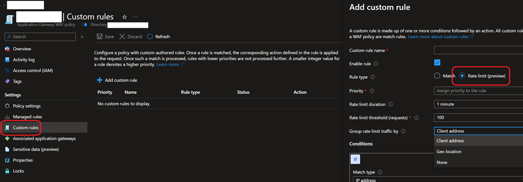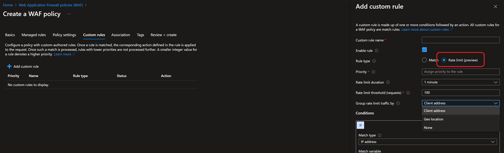 When editing an existing WAF policy, the rate-limit option is available under the Custom rules blade