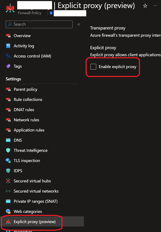 To enable explicit proxy mode, lookup for the Azure policy you want to enable to functionality and access the Explicit proxy blade to turn it on