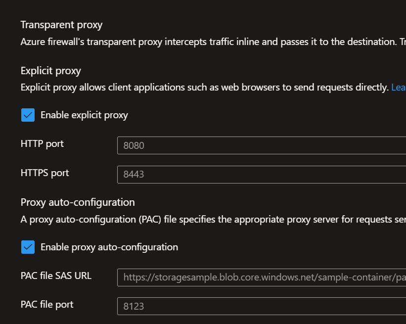 With this mode enabled, you have the option to configure a proxy setting (either manually or using PAC file) on the sending application, such as a web browser, with Azure Firewall acting as the designated proxy.