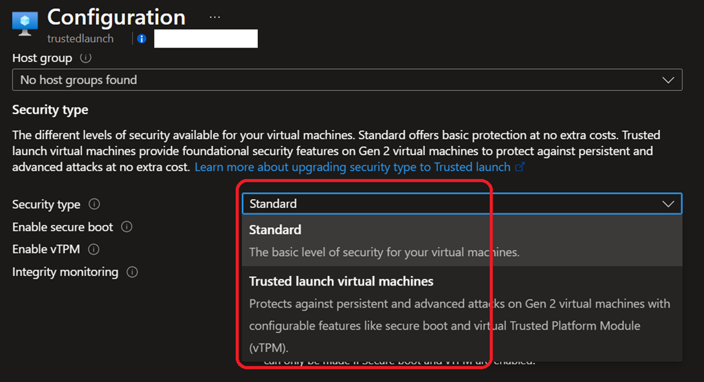 Once trusted launch is selected, you can then the security features you want to enable.