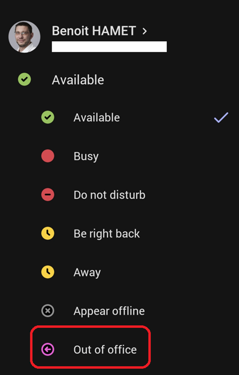 To do so, open the status menu to select Out of office