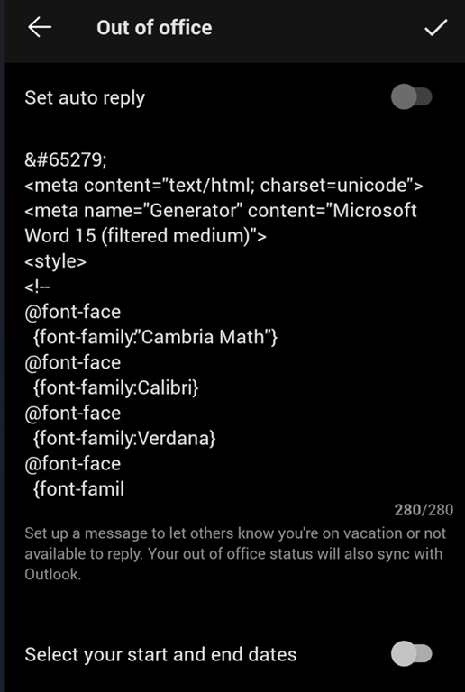 Then you can set your out of office message – note: if already have one set from your Exchange mailbox, the message is automatically reused – and the activation/deactivation dates