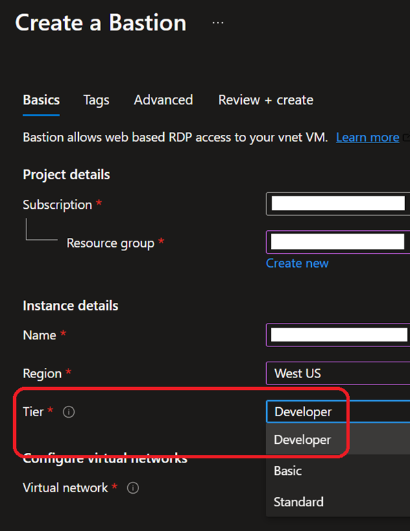 Unlike the Basic and Standard SKU’s, the Developer does not need nor use the AzureBastionSubnet subnet in the virtual network and does not need neither a public IP.