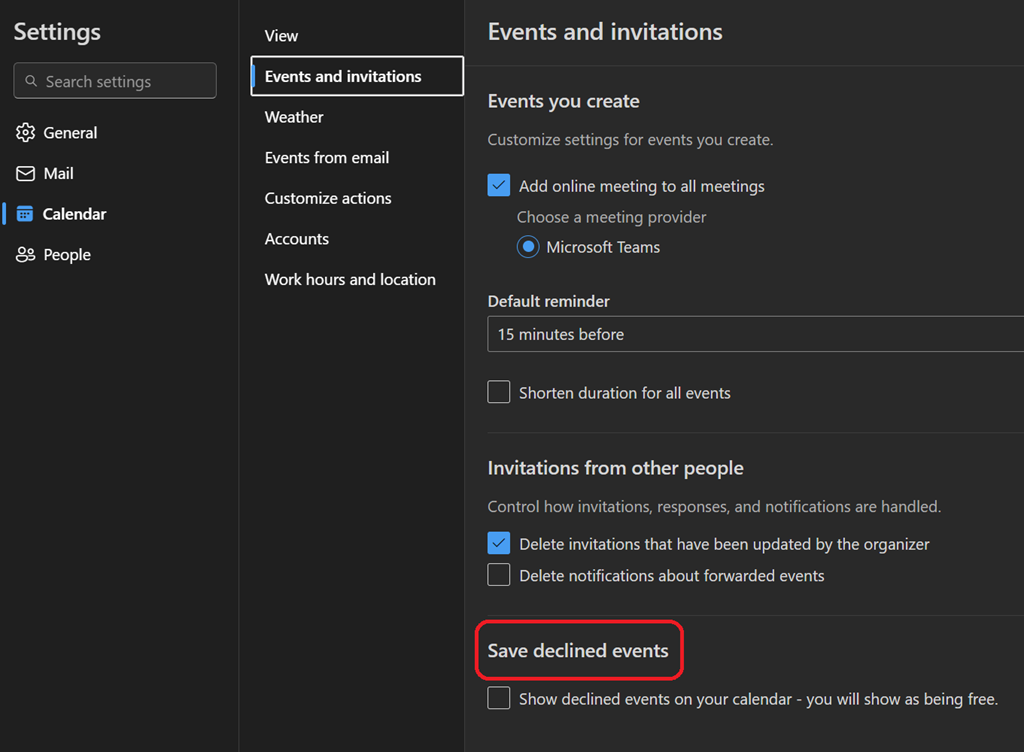 Then access the Calendar\Events and invitations section to enable the Save declined events option