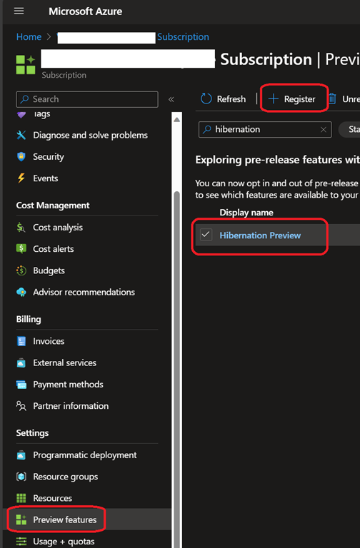Access the Preview features blade on the subscription and search for hibernation