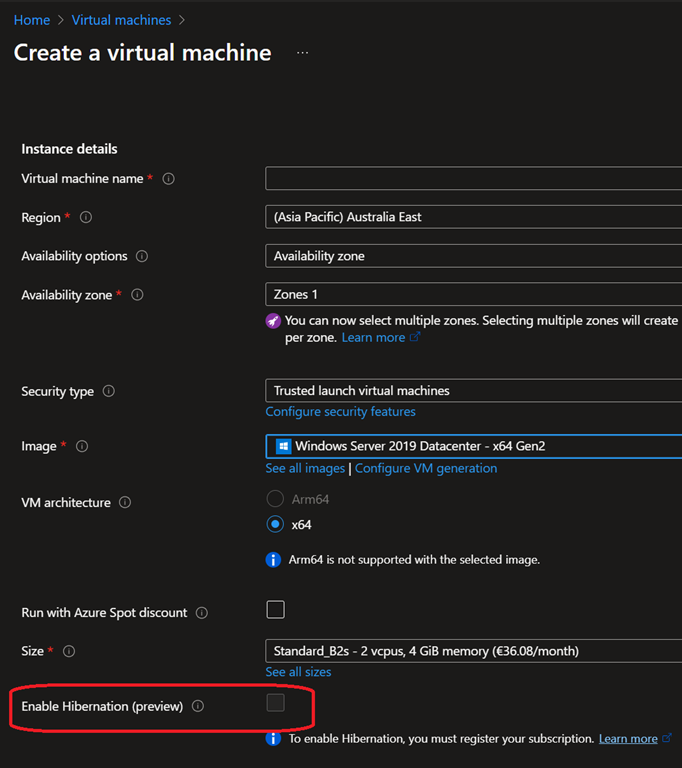 - Hibernation is only supported with Nested Virtualization when Trusted Launch is enabled on the VM